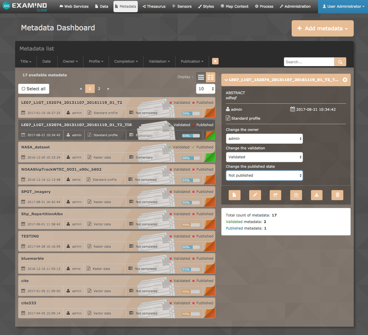 Examind-Cloud is a platform that brings together a set of services allowing the development of a geospatial cloud solution. It enables the data diffusion and analysis in a Big Data context. The cloud-based solution is an evolution of Examind Server.